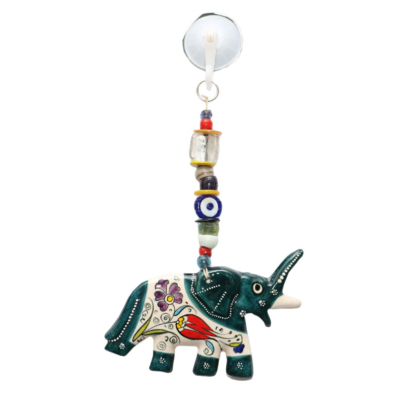 DO YOU LOVE TO WATCH A CUTE BABY ELEPHANT TRYING TO TAKE ITS FIRST FEW STEPS? IT IS A BEAUTIFUL SIGHT, ISN’T IT? THAT IS EXACTLY WHAT IS THIS GLASS AND CERAMIC HANGING IS ABOUT. IT IS A DARK GREEN BABY ELEPHANT SUSPENDED ON A LITTLE ROPE LIKE STRUCTURE. THIS HELPS TO KEEP THE EVIL EYE (NAZAR) AWAY WHILE ALSO ADDING TO THE BEAUTY OF YOUR PARADISE.