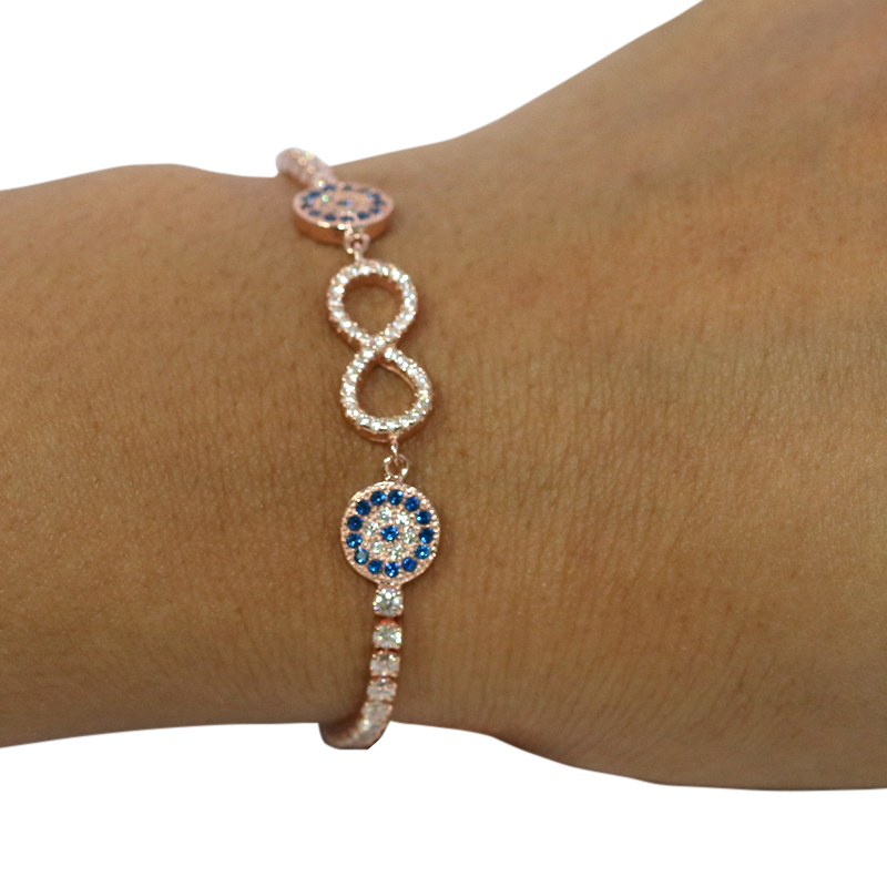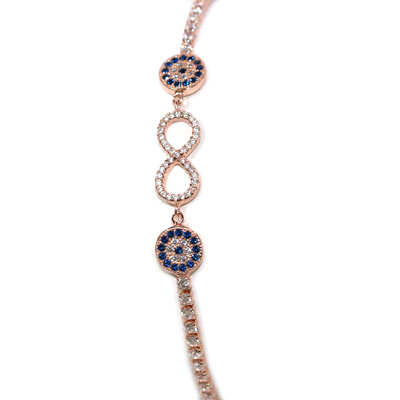 BE PREPARED TO TAKE ON THE WORLD WITH THIS BEAUTIFUL ROSE COLORED BRACELET, COMPLETE WITH ITS INFINITY RING SURROUNDED BY BEAUTIFUL CIRCULAR DESIGNS TO FIGHT THE EVIL EYE (NAZAR) AND EVERY OTHER FORM OF NEGATIVE ENERGY. ITS CLEAR ZIRCON AND BLUE GEMS ARE THE HIGHLIGHTS OF THIS PIECE, AND WILL MAKE SURE YOU FEEL SPECIAL WITH ALL THE COMPLIMENTS COMING YOUR WAY.