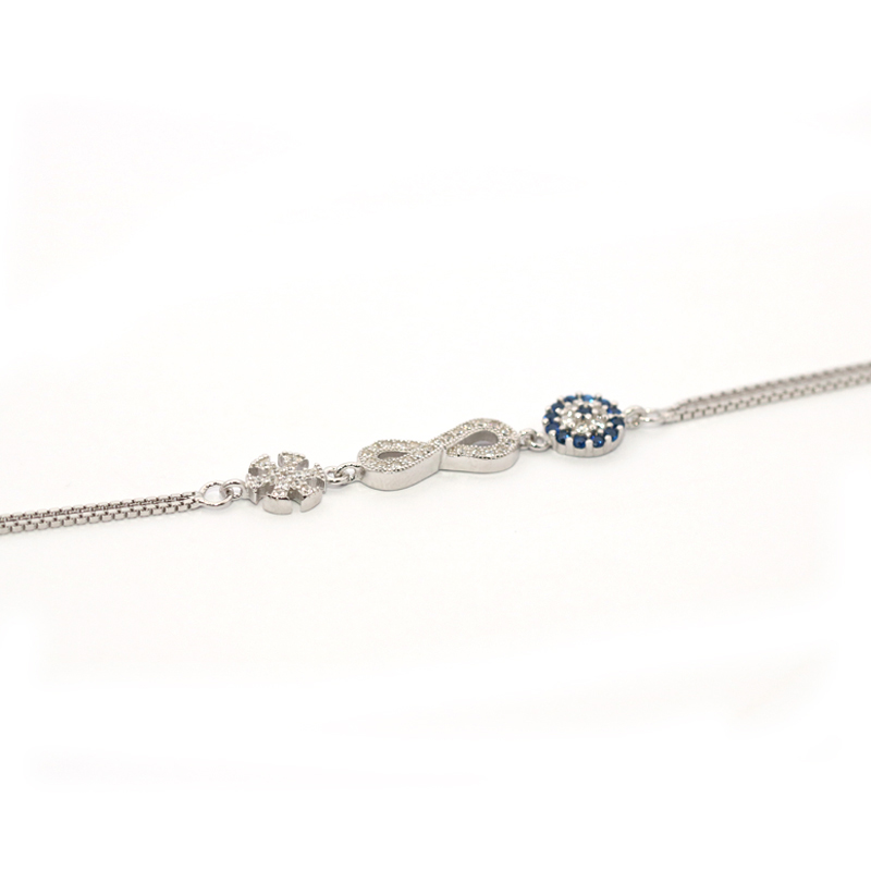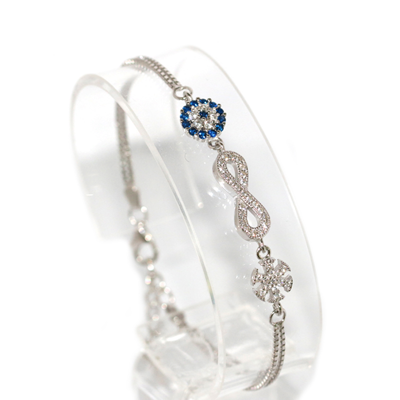 LOVE AND WANT AN INFINITY RING ON YOUR WRIST? HERE IS THE ONE BRACELET YOU NEED. WITH A CENTRAL INFINITY RING DESIGN AND TWO OTHER SUPPORTING DESIGNS WITH CLEAR AND BLUE ZIRCON STONES, SET PERFECTLY ONTO PURE SILVER, THIS IS ONE YOU MUST HAVE THIS SEASON. FLAUNT IT AND PREPARE YOURSELF FOR A SHOWER OF COMPLIMENTS FROM EVERYONE AROUND YOU, WHILE KEEPING THE EVIL EYE (NAZAR) AWAY.
