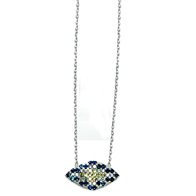 THIS SEASON BECOME THE CENTER OF ATTRACTION BY CONFIDENTLY WEARING THIS SHIELD OF PROTECTION FROM EVIL EYE (NAZAR), ENVY, OR ALL OTHER NEGATIVE VIBES. THIS NECKLACE IS COMPLETE WITH ITS PENDANT THAT IS IN THE SHAPE OF AN EYE, COVERED IN CLEAR ZIRCON AND BLUE STONES. PAIR THIS WITH YOUR CASUAL, FORMAL, OR PARTY AVATAR ALIKE TO BECOME THE TALK OF THE TOWN.
