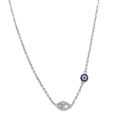 DRESS UP EFFORTLESSLY AND FEEL THE AIR AROUND YOU PUMP CONFIDENCE WHEN YOU WEAR THIS UBER GORGEOUS NECKLACE. THIS SILVER MASTERPIECE HAS A BEAUTIFUL PENDANT THAT SYBOLIZES THE PROTECTION FROM THE BAD EYE. KEEP THE EVIL EYE (NAZAR) AWAY WITH THE HELP OF ITS CLEAR ZIRCON AND BLUE GEMSTONES WHILE LOOKING LIKE A DIVA THIS FESTIVE SEASON.